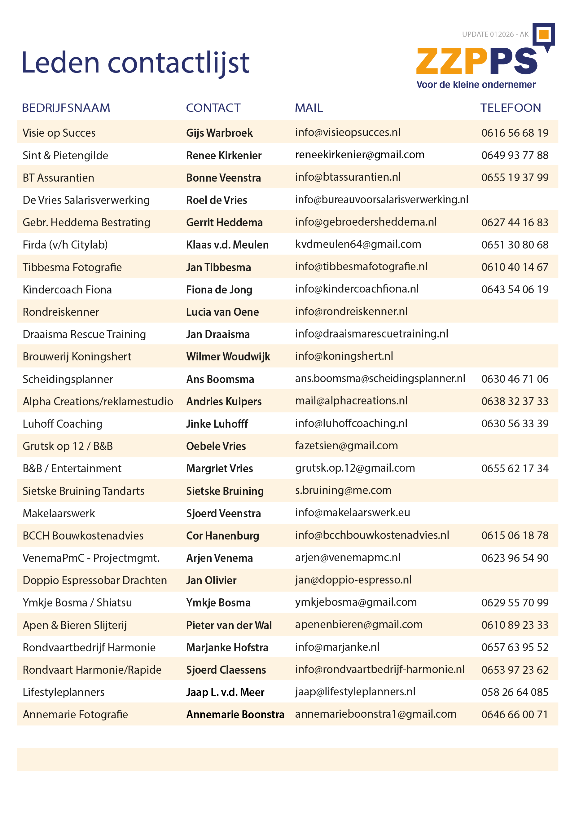 Check svp je eigen gegevens of ze nog steeds correct zijn. Sta je er nog niet tussen maar wil je dat wel? Stuur dan een mailtje met je gegevens naar Andries.